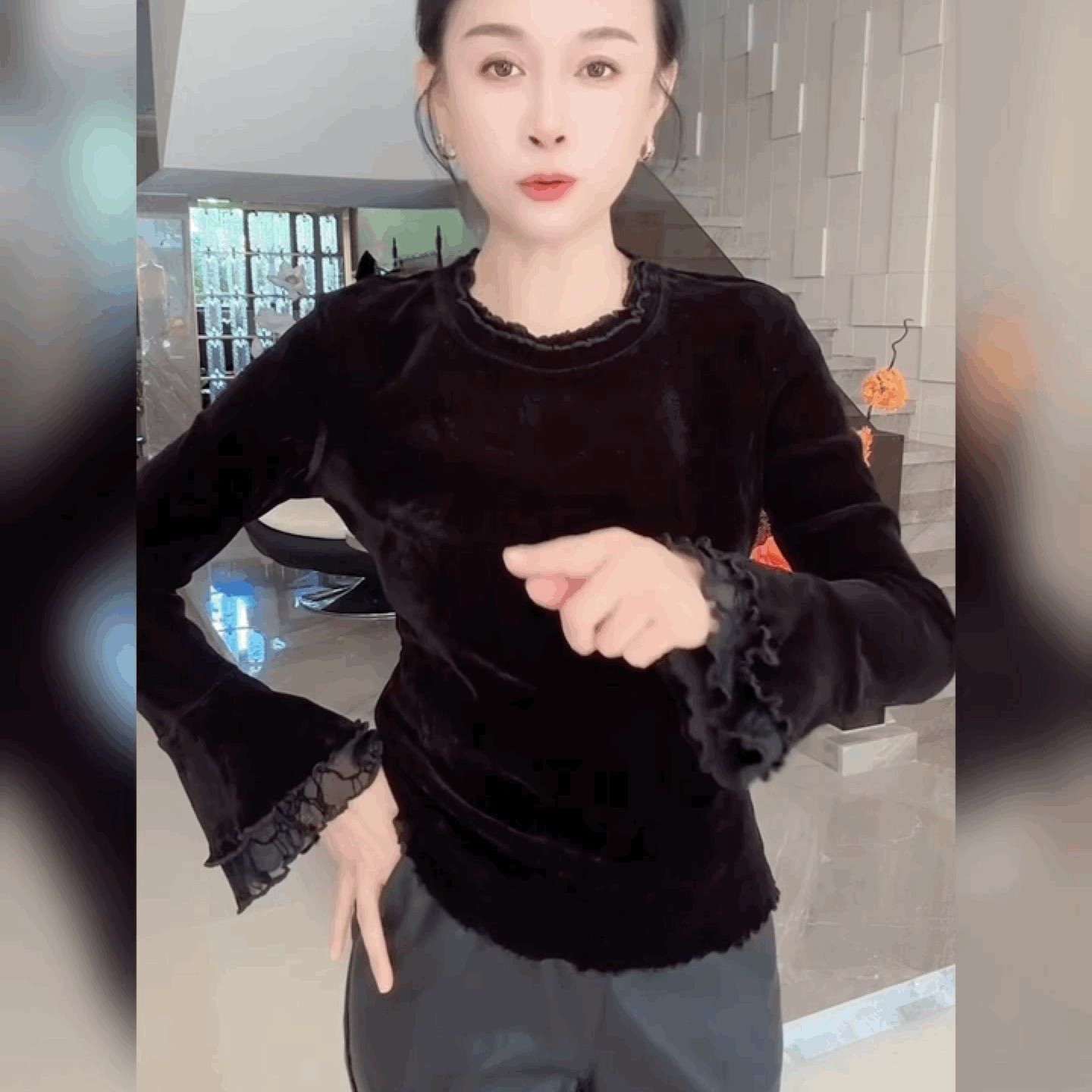 金丝绒拼接蕾丝喇叭袖打底衫高级感气质圆领T恤女长袖黑色上衣潮