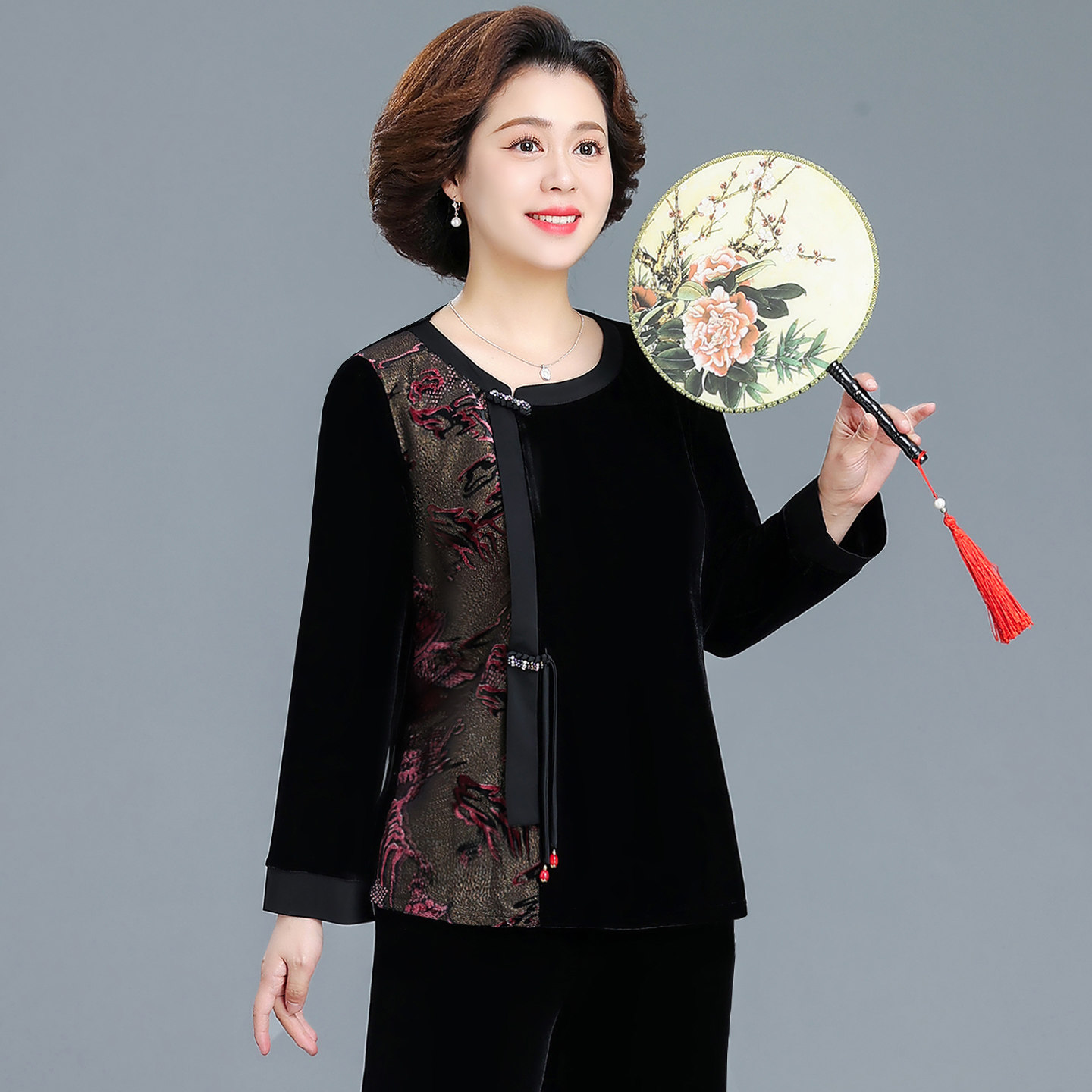时尚中国风烫钻烧花V领金丝绒上衣女春秋新款休闲百搭中老年女装