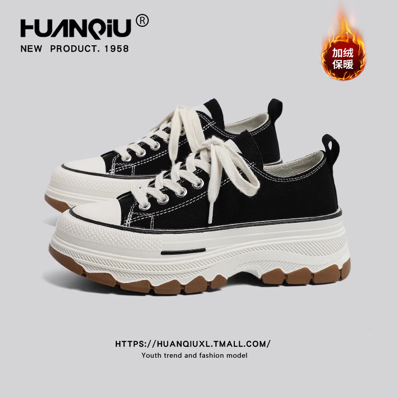 环球加绒厚底帆布鞋女款2025秋冬新款增高鞋百搭女鞋黑色松糕板鞋