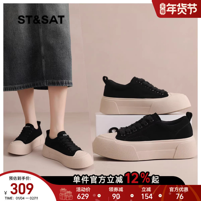 星期六板鞋女款2025春秋新款爆款厚底黑色帆布鞋女运动休闲饼干鞋