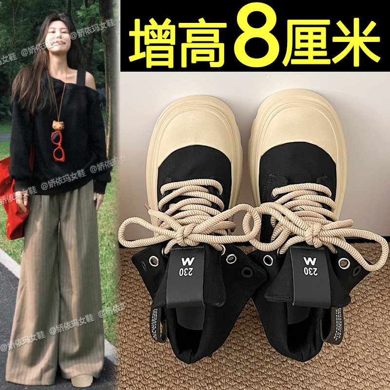 厚底高帮帆布鞋女2025新款春秋百搭黑色马丁靴内增高休闲短靴子
