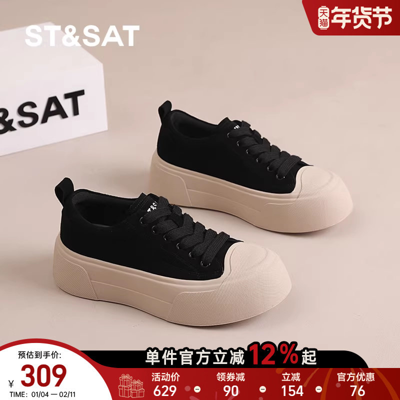 星期六厚底板鞋女鞋春季新款百搭休闲增高运动鞋子女士黑色帆布鞋