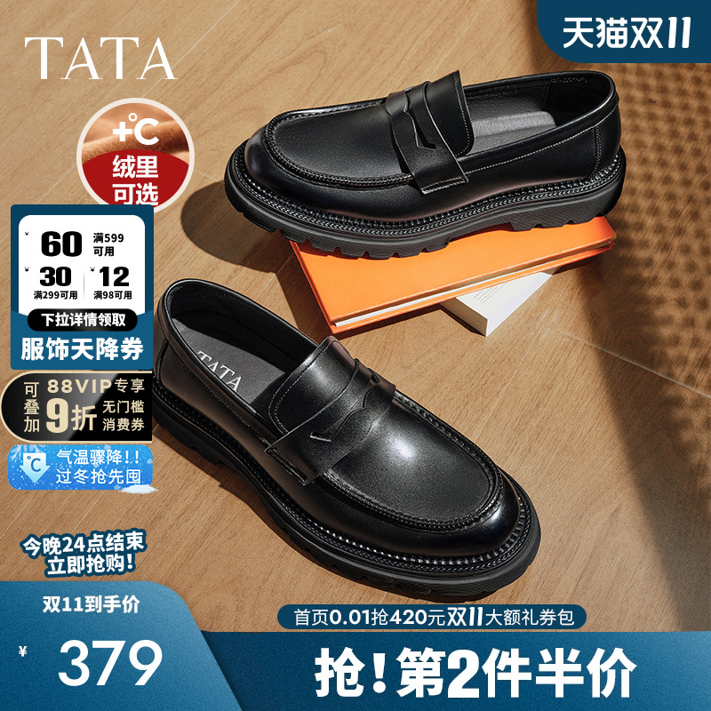Tata他她商务休闲皮鞋男士一脚蹬真皮厚底乐福男鞋德比鞋子爸爸鞋