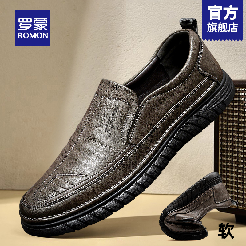 罗蒙休闲皮鞋男2025新款冬季皮面一脚蹬乐福男鞋软底中年爸爸鞋RM