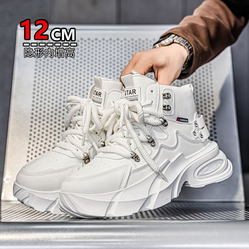 痞帅高级感12cm男士内增高鞋白色高帮老爹鞋男士厚底内增高马丁靴