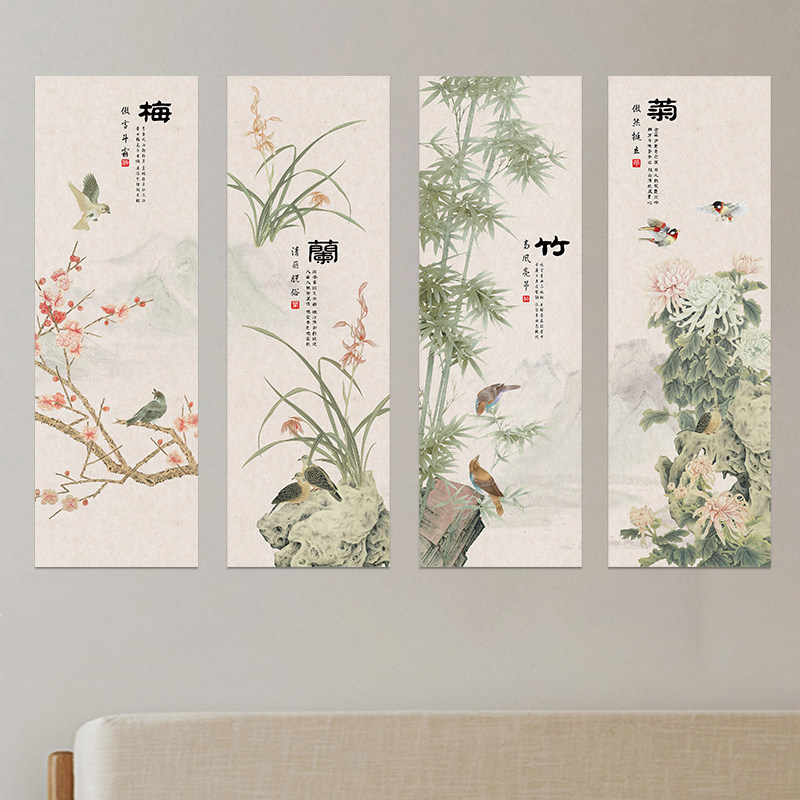 梅兰竹菊客厅沙发背景墙装饰画新中式餐厅包间贴画壁画茶室四联画