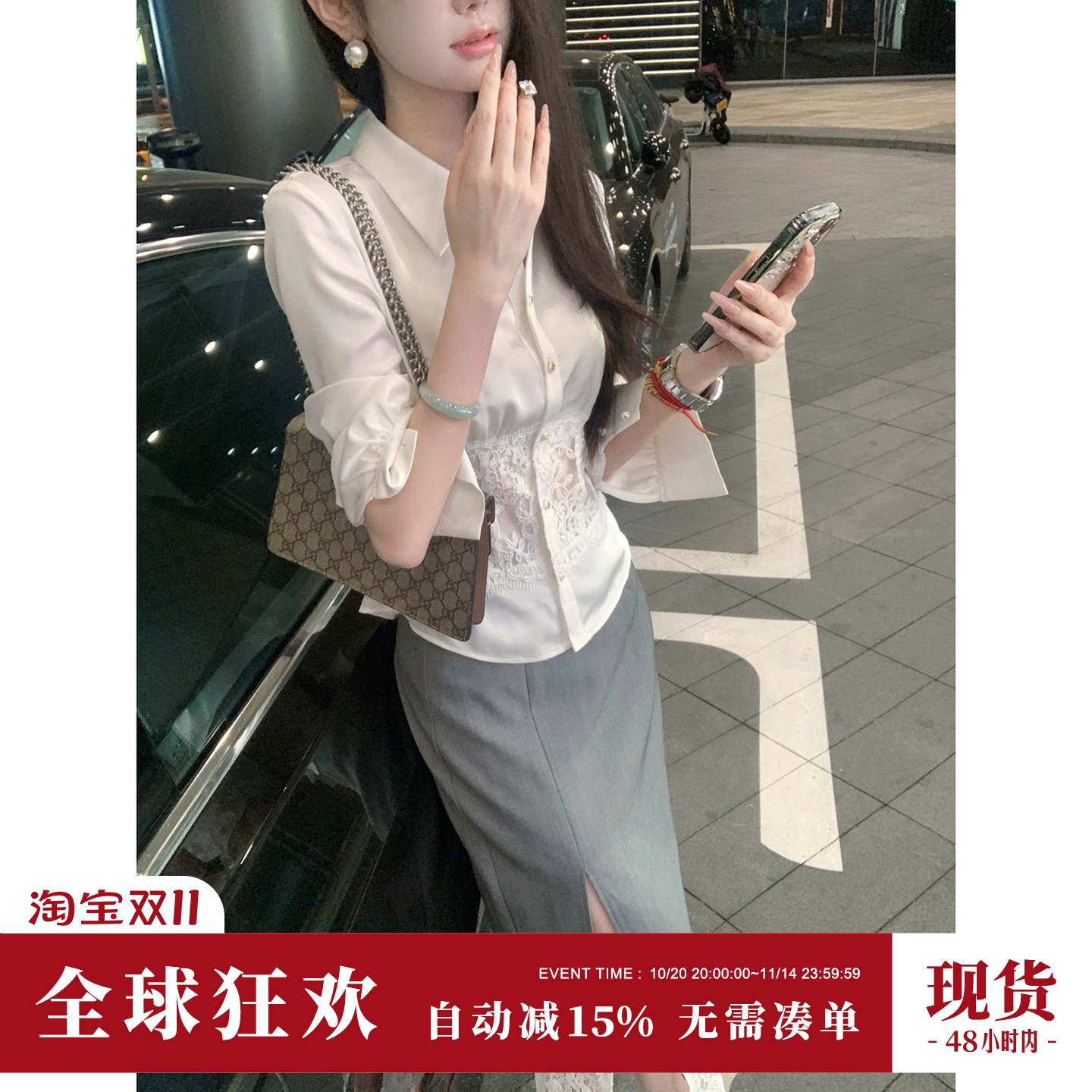 Sun雅乔【引力法则】蕾丝束腰白衬衫+蕾丝裙摆灰色开叉半身裙套装