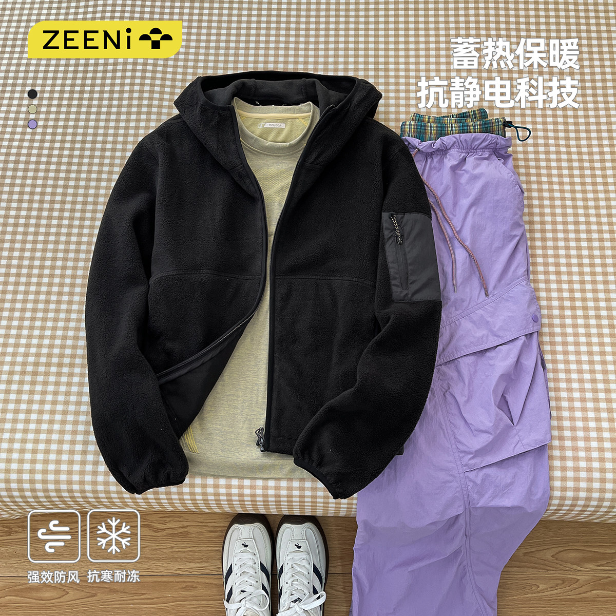 ZEENI 时尚轻户外拼色羊羔绒开衫外套女加绒休闲裤徒步穿搭套装