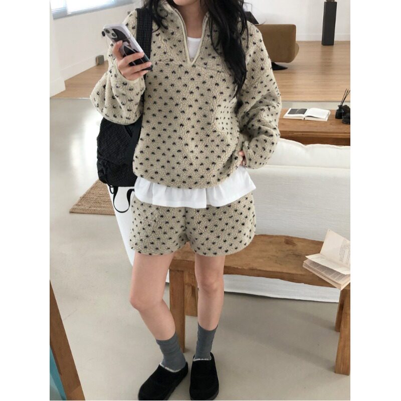 【纸落云烟】Uena美式复古牛奶花纹仿羊羔毛外套直筒休闲裤套装女