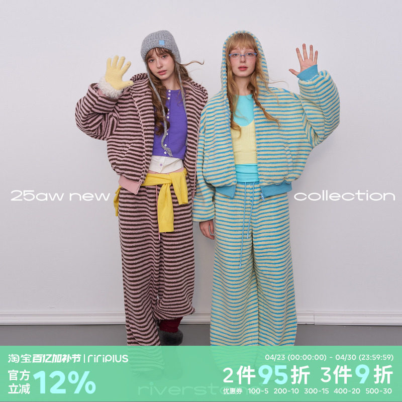 riverstone plus 条纹羊羔绒棉服外套女摇粒绒连帽上衣加厚套装
