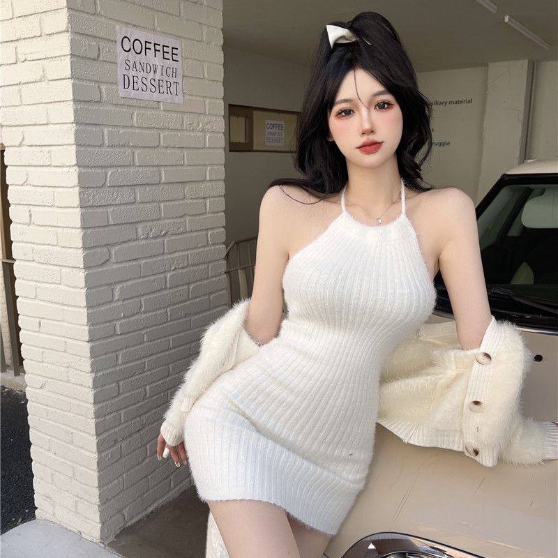 水貂绒挂脖针织吊带背心连衣裙女秋冬新款辣妹包臀短裙性感小裙子