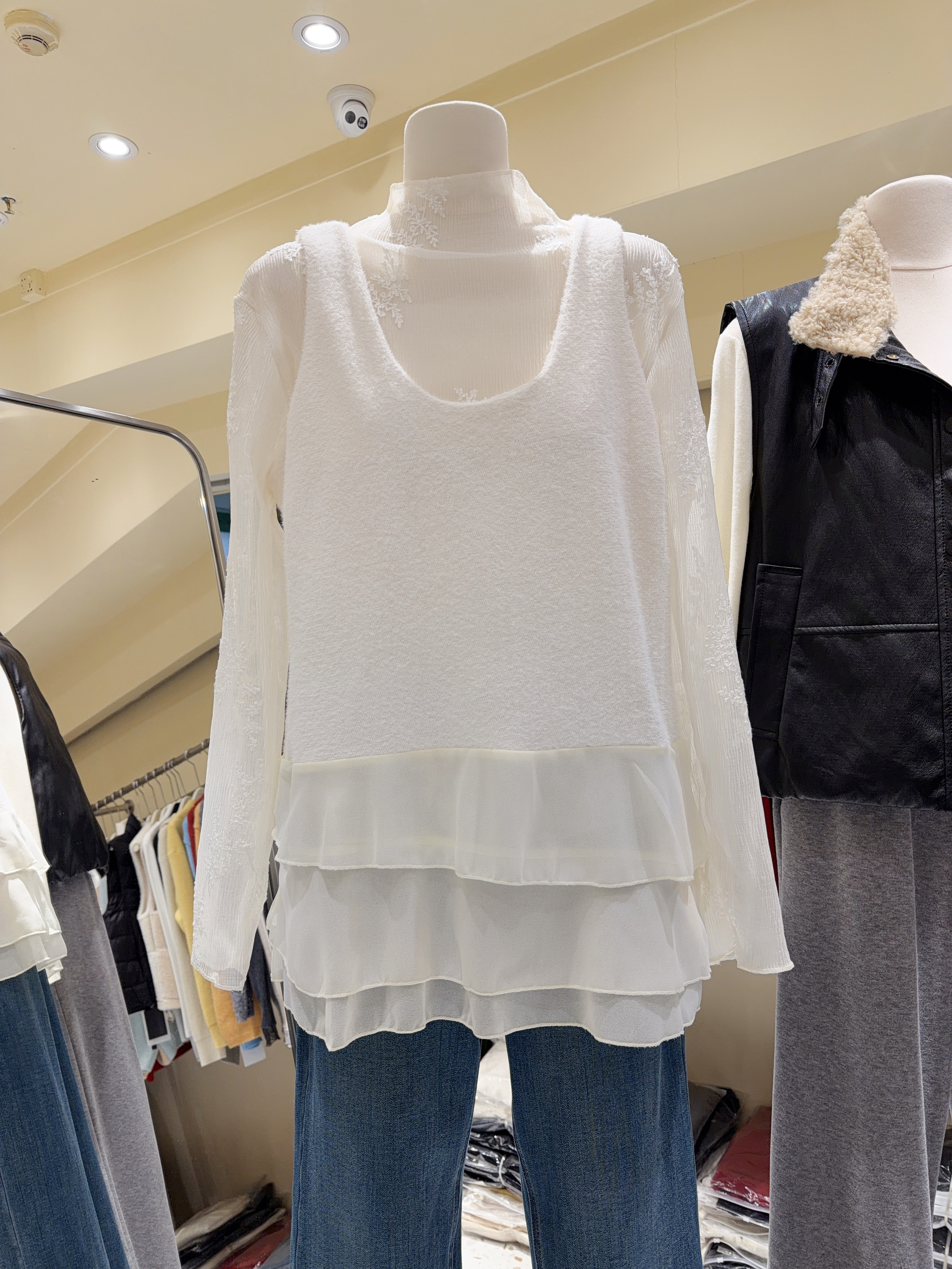 2026小众穿搭!叠穿两件套上衣网纱打底衫+水貂绒吊带背心套装女