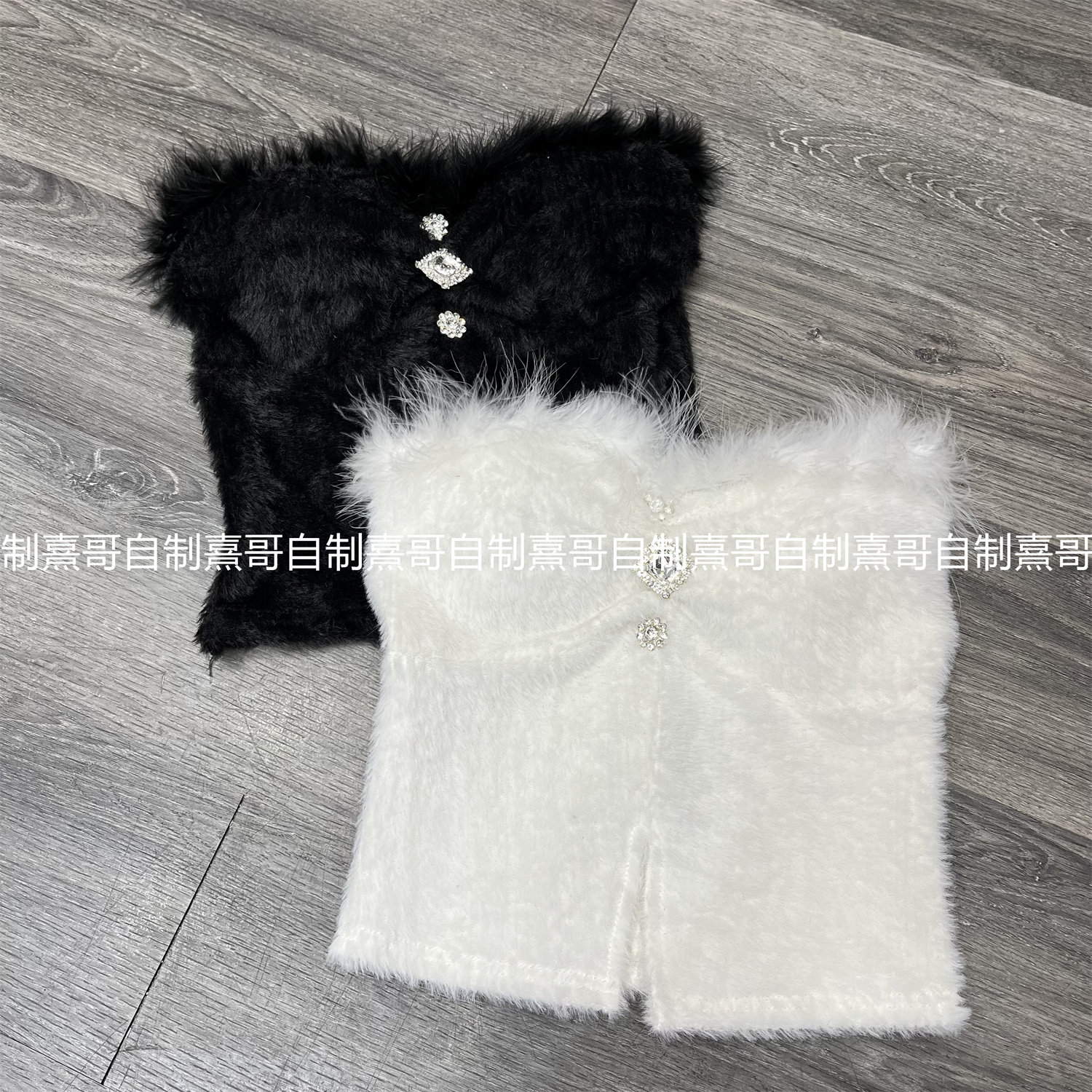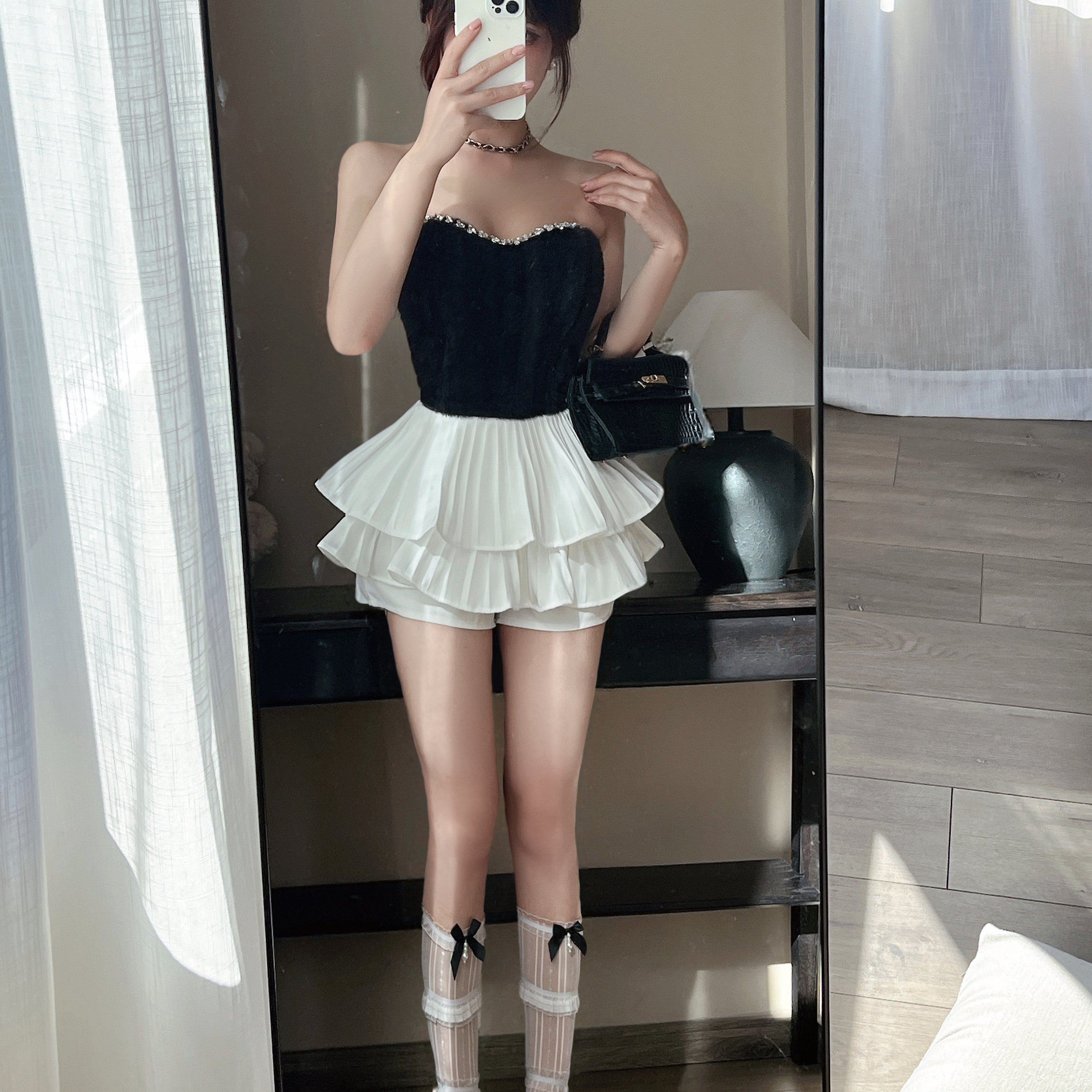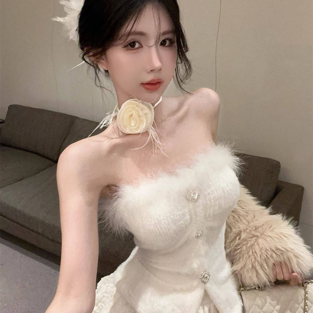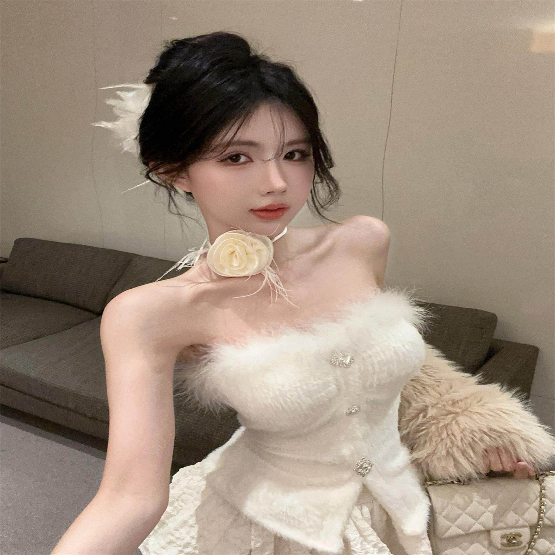 实拍法式钻链设计感水貂绒吊带背心内搭辣妹纯欲外穿抹胸+蛋糕裙