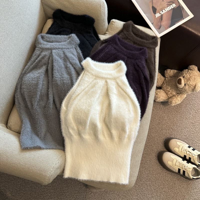 纯欲性感水貂绒毛衣吊带美背背心秋冬内搭挂脖短款甜辣上衣打底衫