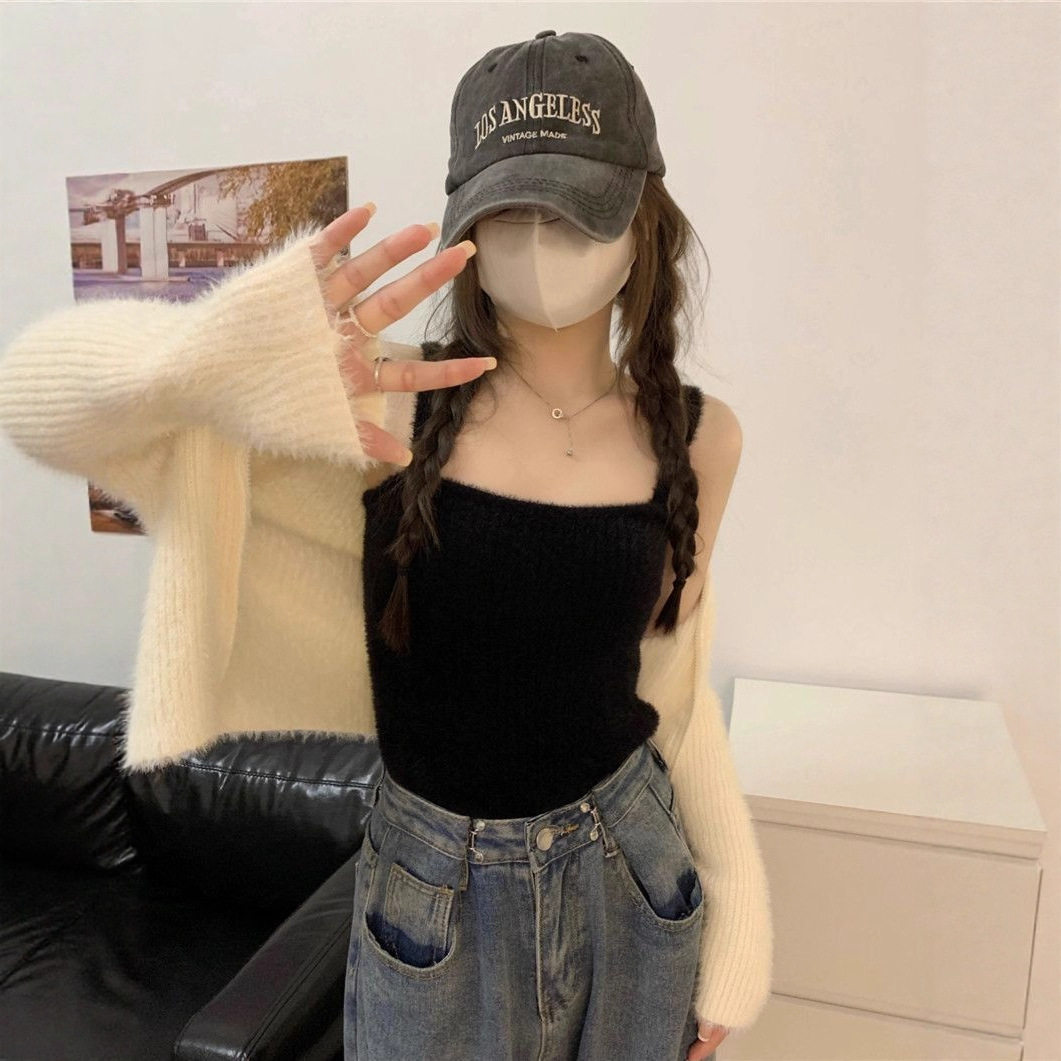 高级感内搭蕾丝钩花吊带背心女秋冬新款气质水貂绒针织开衫两件套