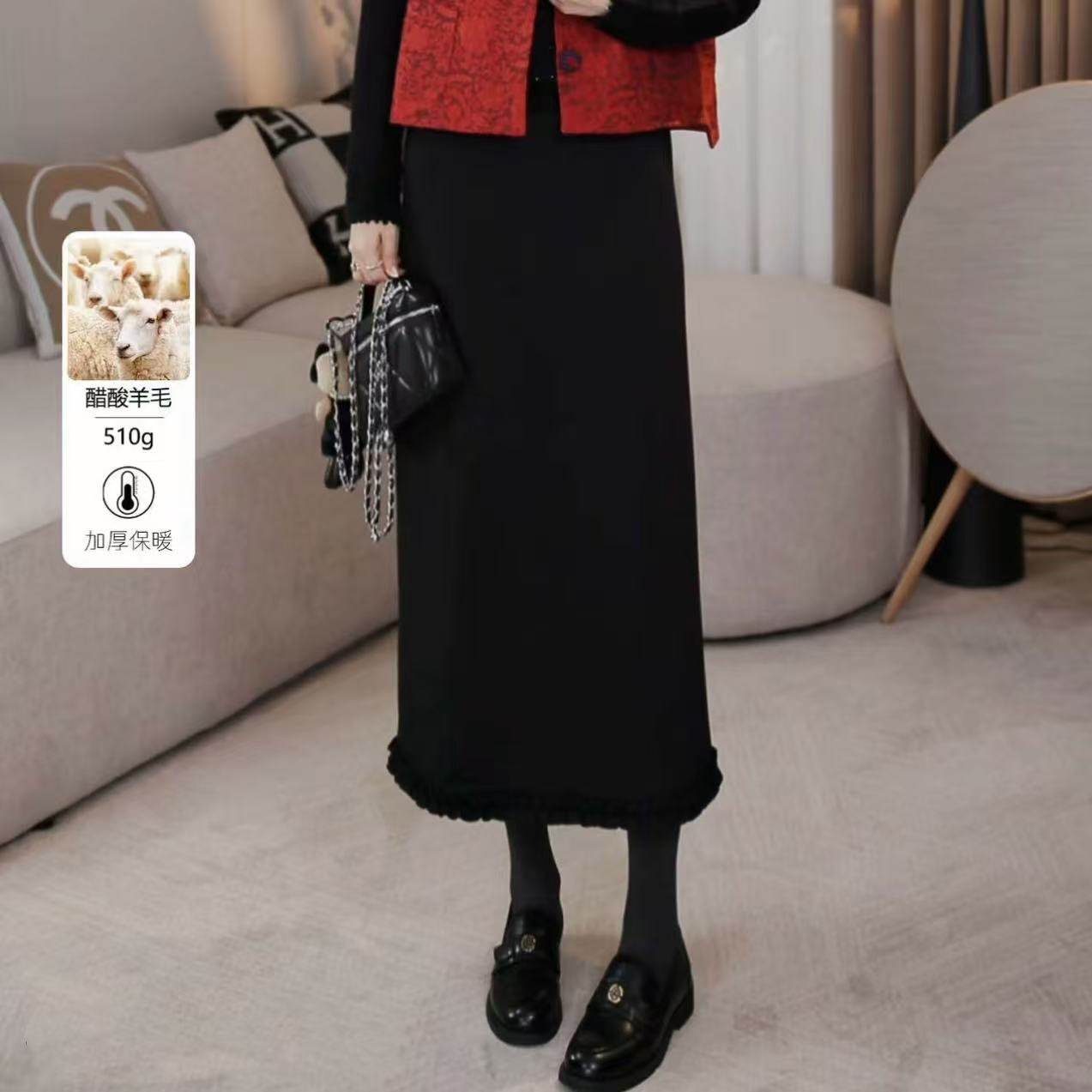 夏央2025冬新款金加绒羊绒木耳边后开叉直筒半身裙长裙女#7751