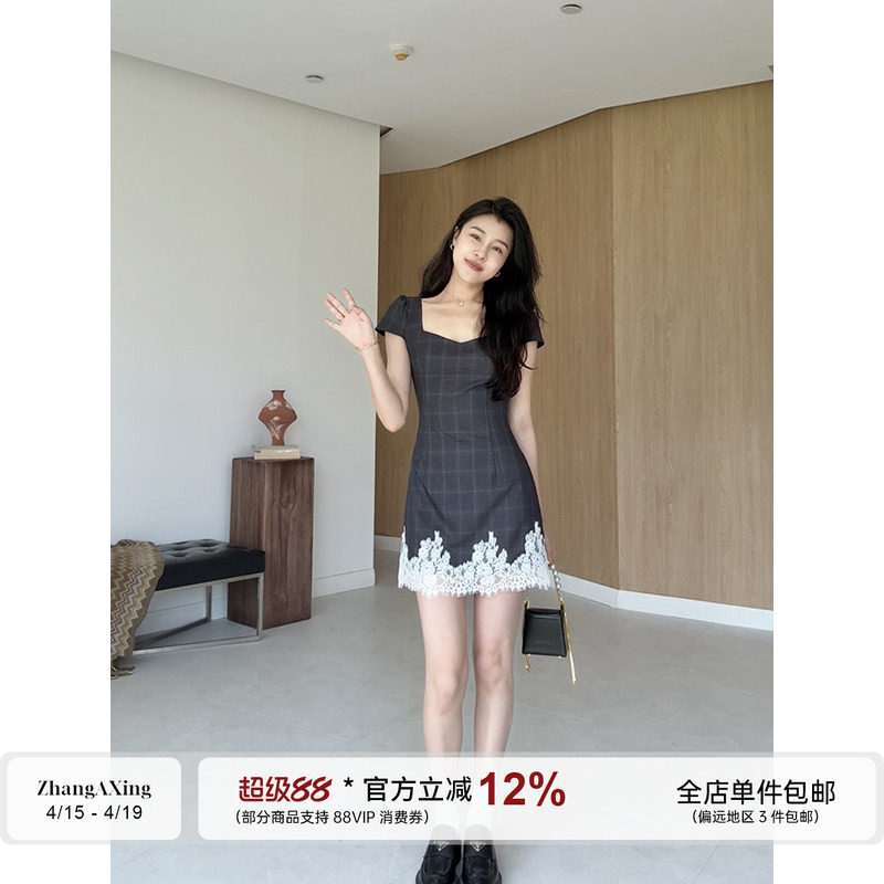 张阿星【韩感轻盈】格纹蕾丝碰撞气质赫本方领收腰修身A字连衣裙