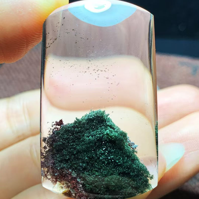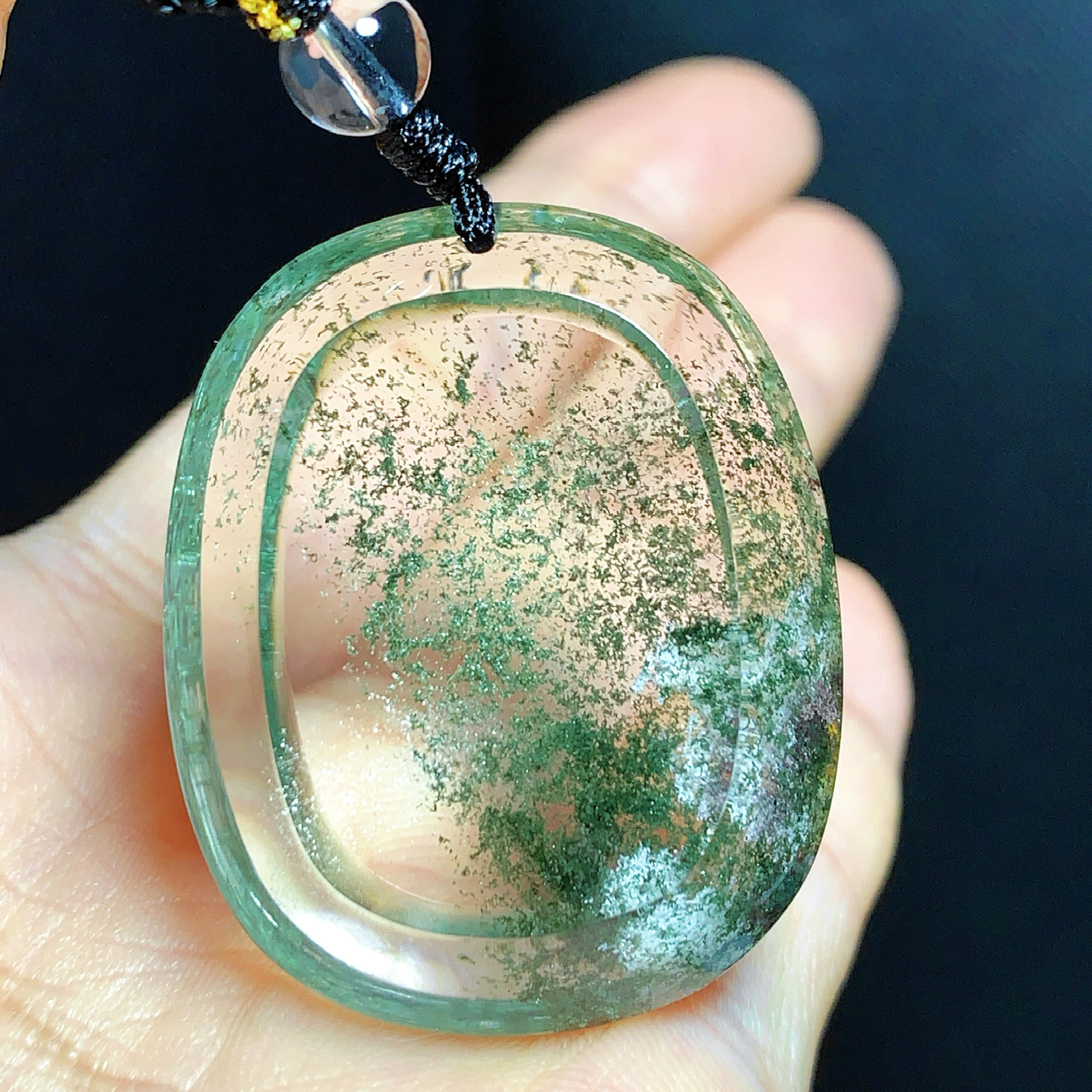 天然水晶绿幽灵四季彩幽灵项链吊坠聚宝盆千层山无事牌方牌男女款