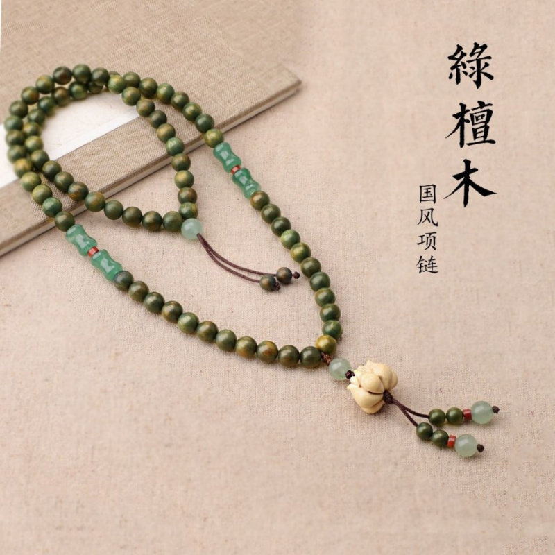 原创古风滴血莲花绿檀项链中长款串珠毛衣链女百搭中国风玉竹节女