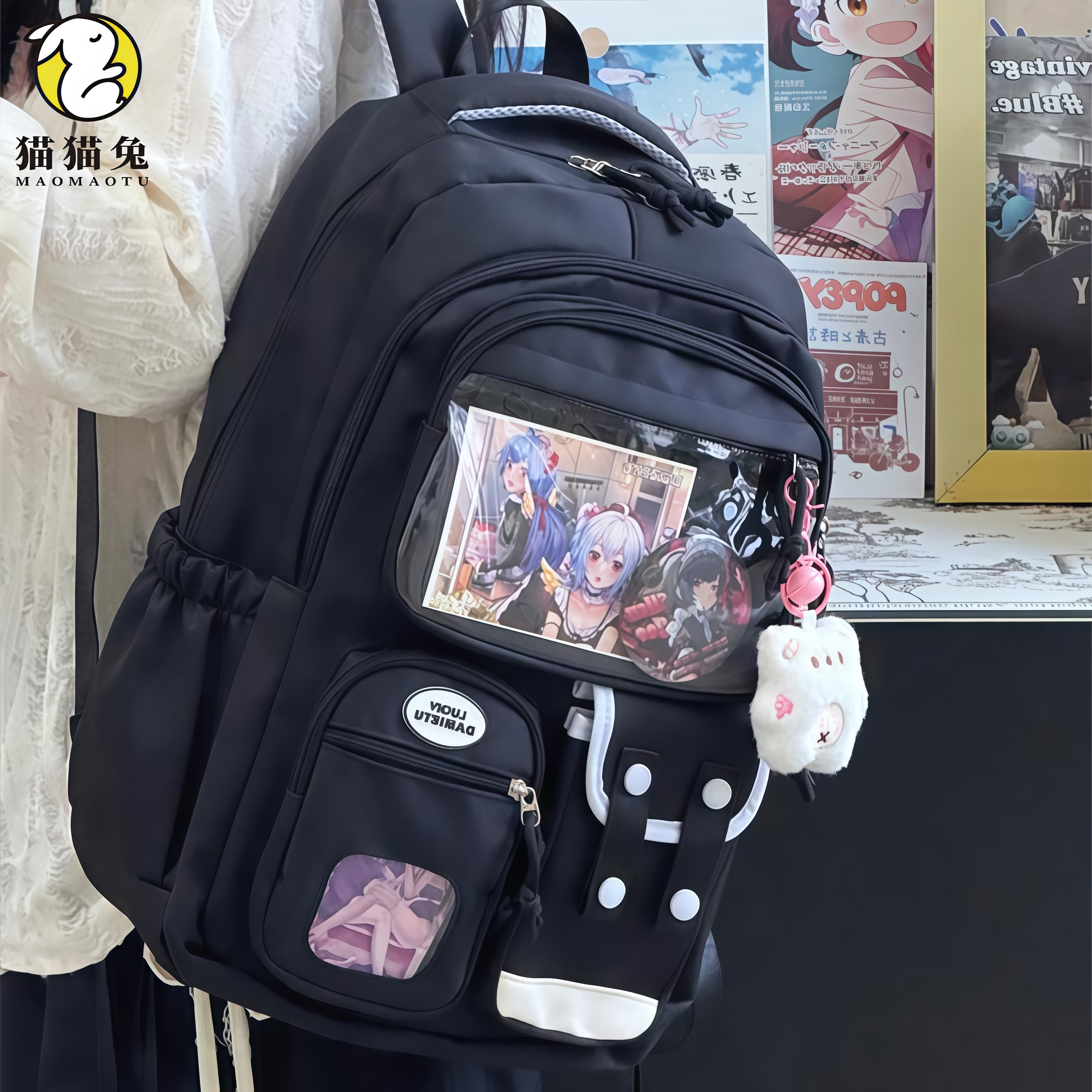 黑色痛包女大容量双肩包初中高中学生书包二次元周边谷子吧唧背包