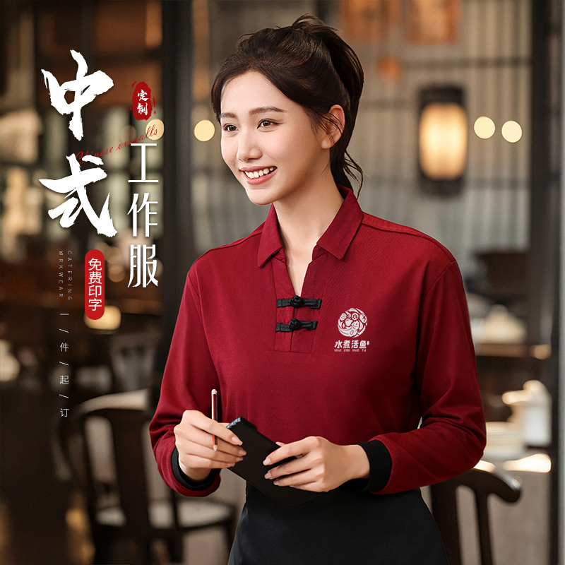 中餐厅服务员工作服长袖女餐饮火锅店中式饭店酒店农家乐秋冬装男