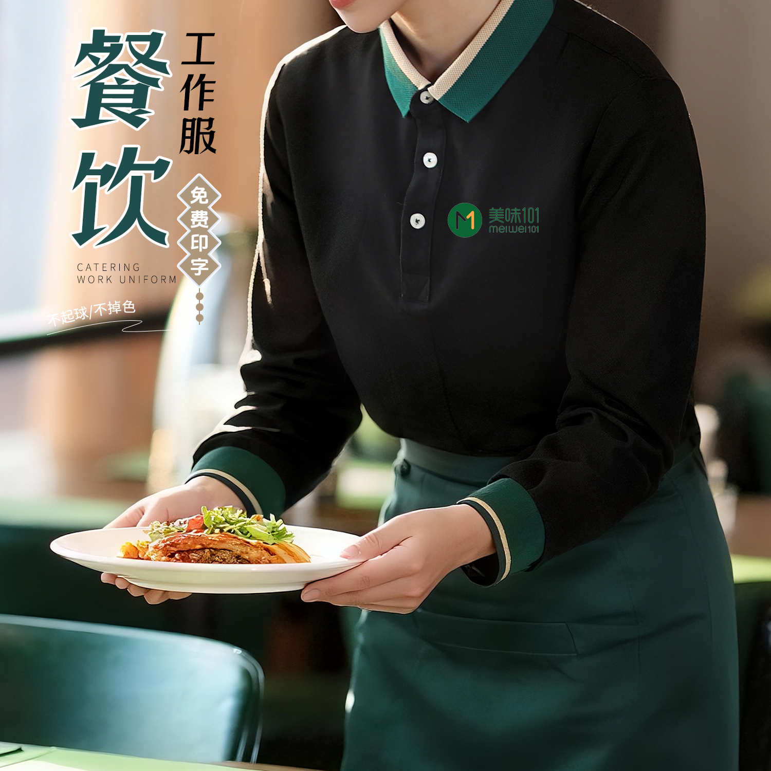 餐饮服务员工作服Polo衫长袖定制火锅奶茶快餐酒店翻领T恤印logo