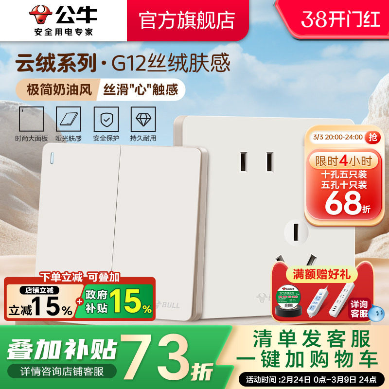 公牛官方旗舰店插座公牛开关插座官方旗舰店正品5孔公牛g12米绒白