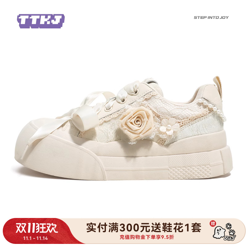 TTKJ玫瑰花帆布鞋子女2025秋新款白色大头厚底增高小白鞋休闲板鞋