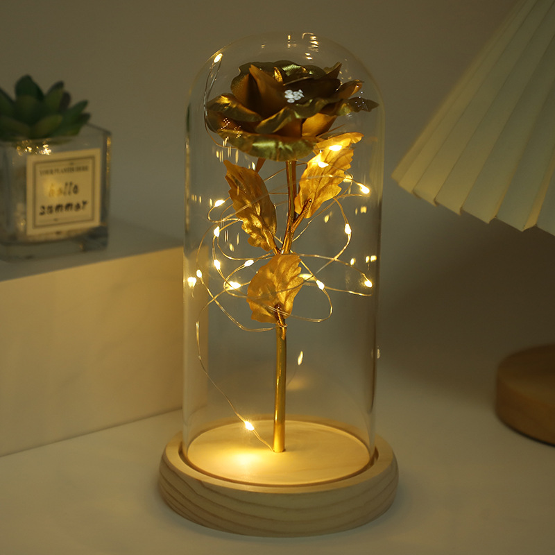 金箔玫瑰花玻璃罩led灯发光永生仿真花情人节礼物圣诞节创意摆件