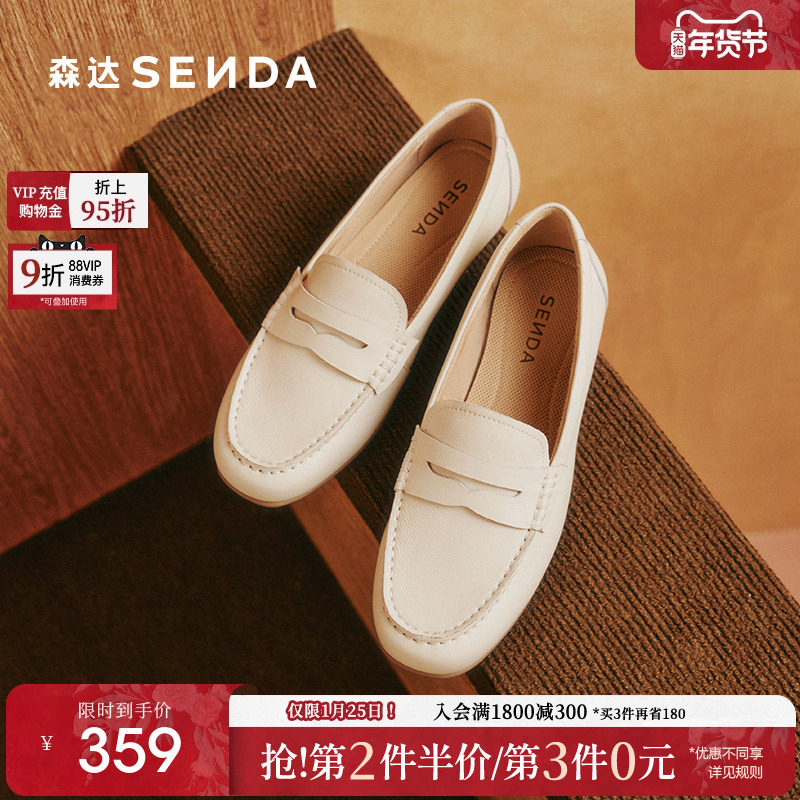 森达白色乐福鞋女鞋新款商场同款牛皮舒适通勤皮鞋平底鞋黑色单鞋