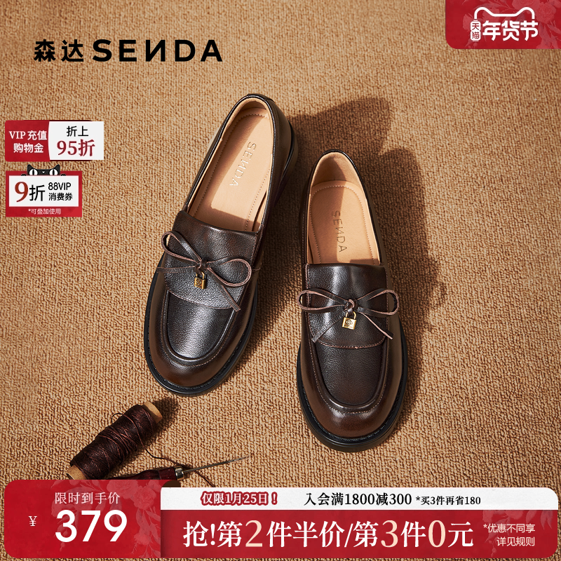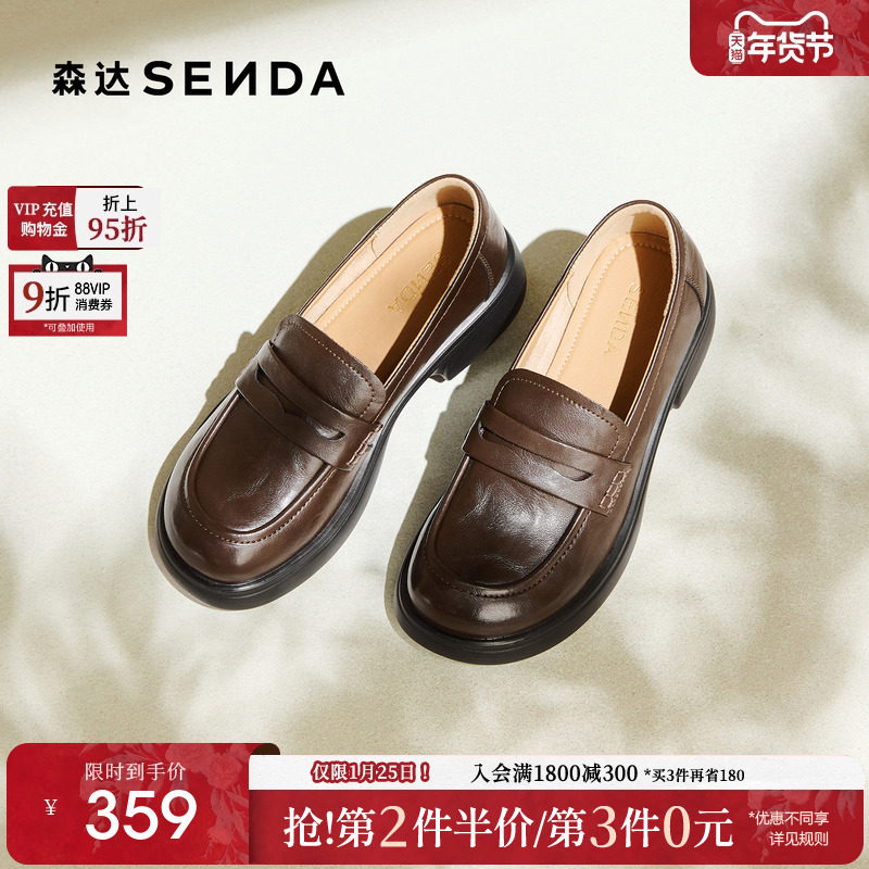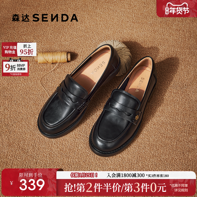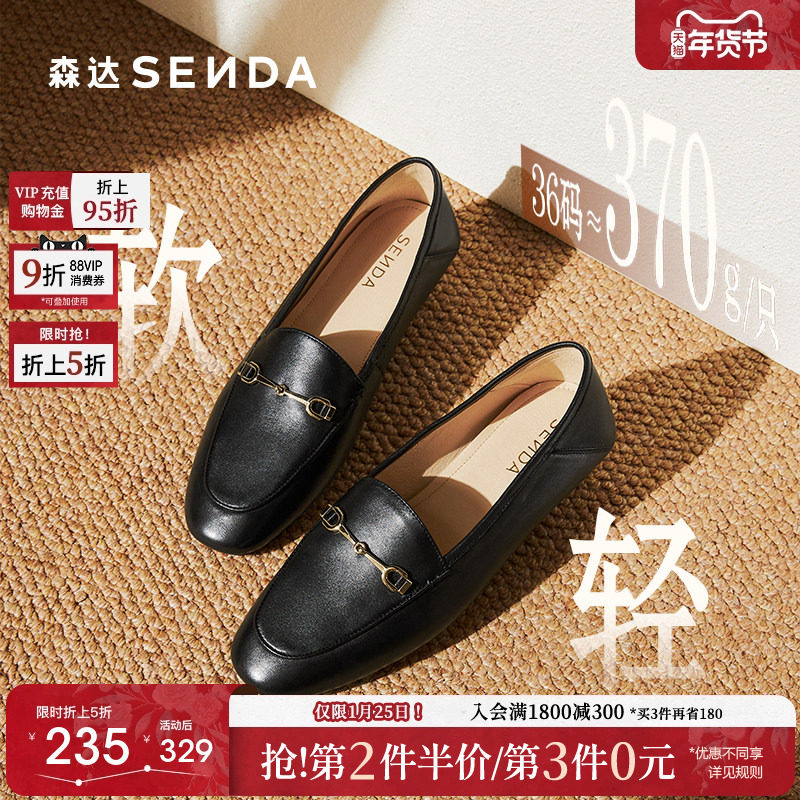 森达超软羊皮新款小金豆乐福鞋女鞋厚底皮鞋商场同款平底黑色单鞋