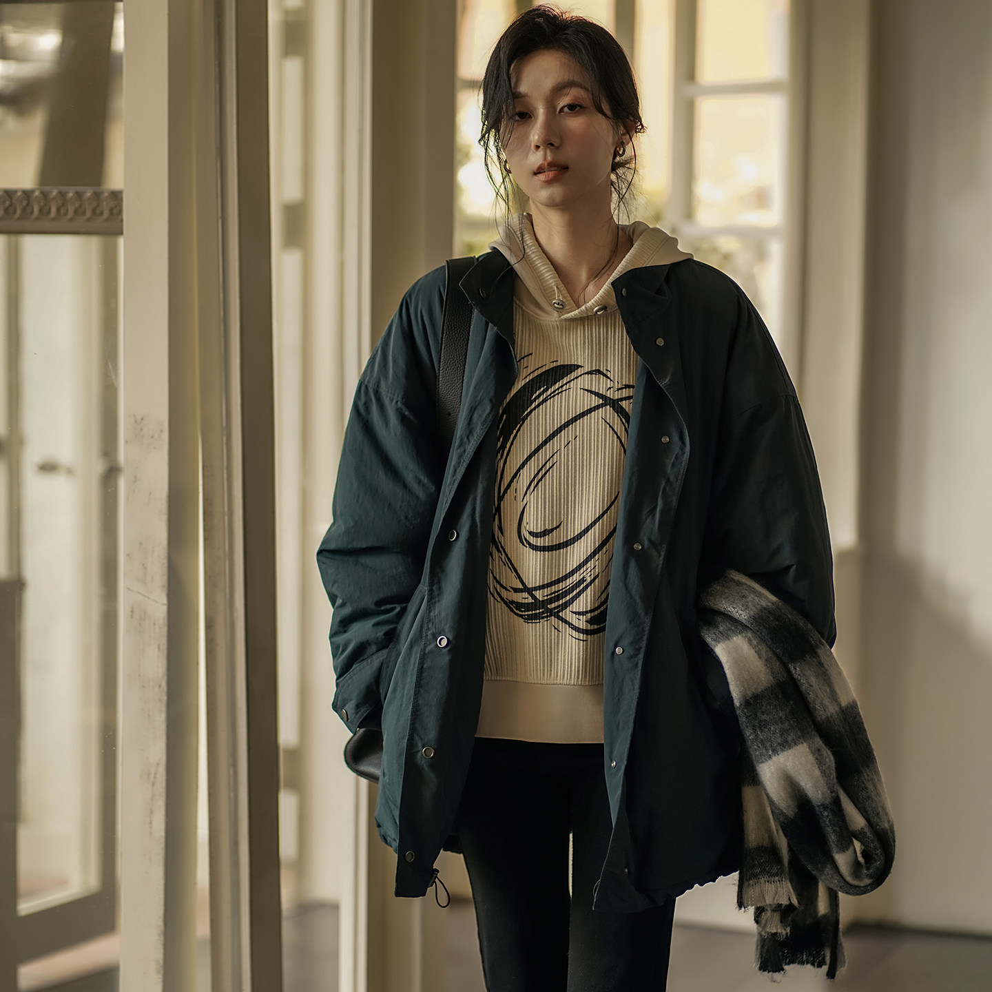 2025年秋冬新款 日系中长款女装宽松茧型包臀棉服 连帽显瘦毛领