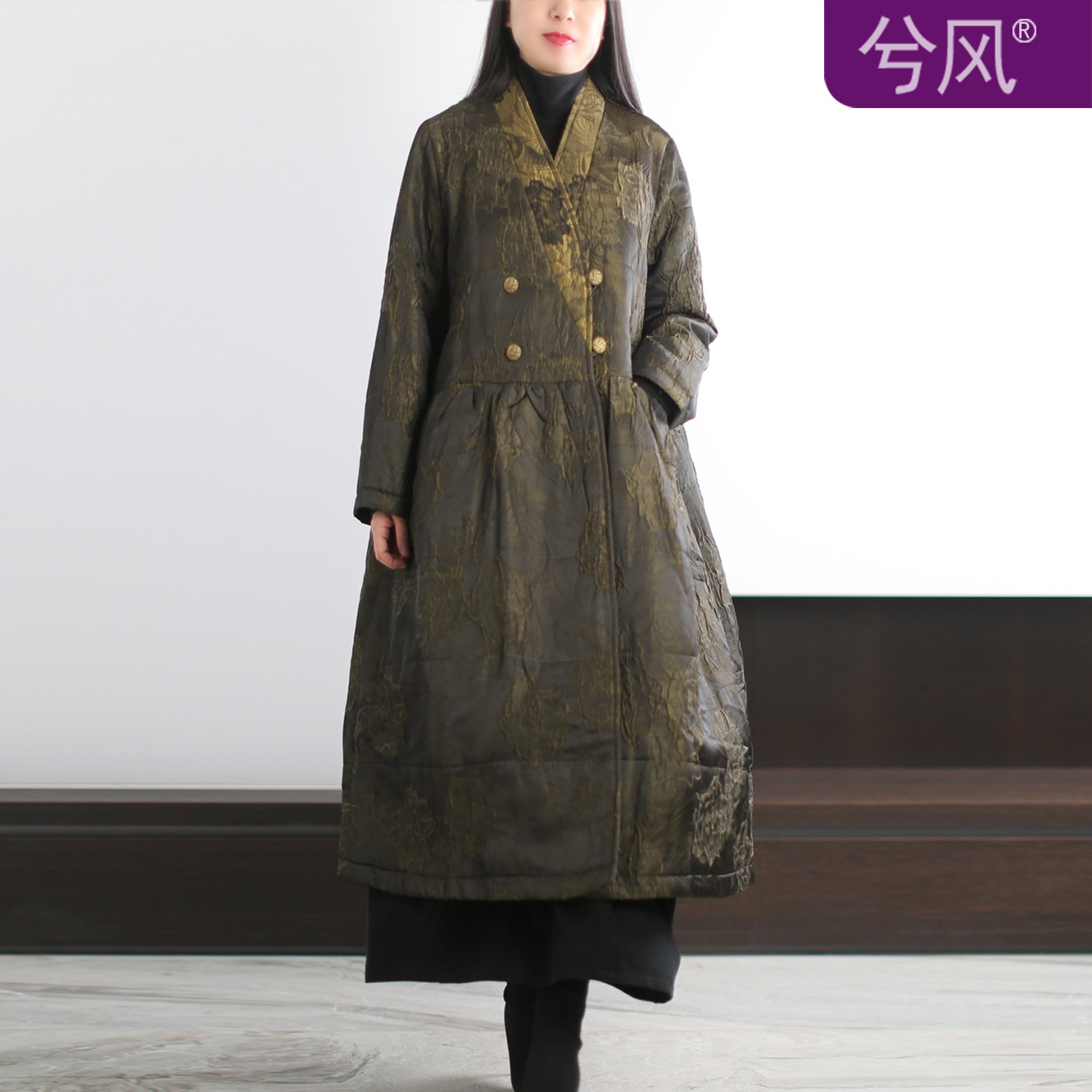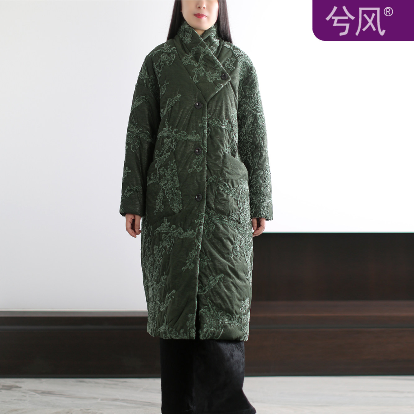设计感棉麻提花中长款复古禅意棉衣 秋冬新中式茧型风衣外套女士