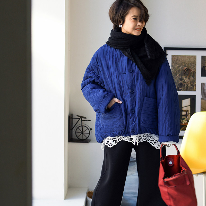F77880 通勤简约圆领条纹肌理感茧型宝蓝色加厚棉服女冬 米兰宣言