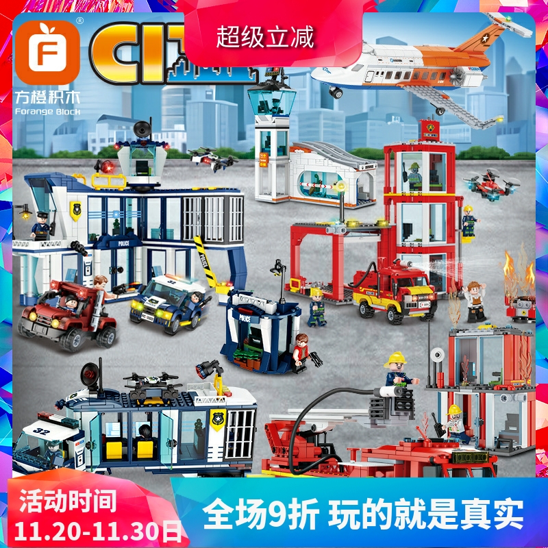 积木城市消防总局小颗粒拼装玩具消防车警察局拼图男孩儿童6-8岁