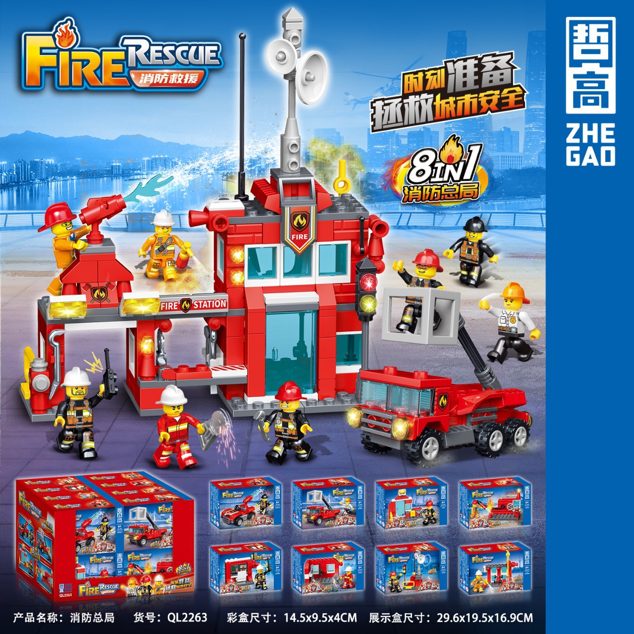 哲高积木城市QL2263消防总局消防车人仔救火车拼装儿童玩具男孩