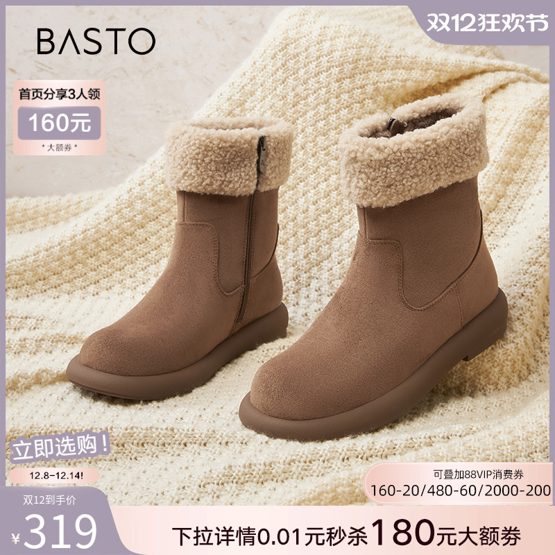 百思图冬新款加绒加厚保暖雪地靴毛毛鞋厚底女大棉鞋短靴M5311DZ4