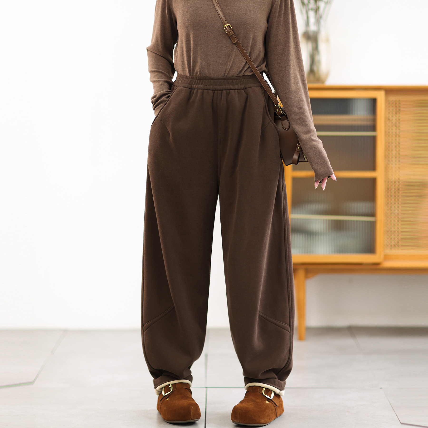 直降福利 不对称剪裁加绒休闲裤女~美拉德棕松紧腰针织棉哈伦裤冬