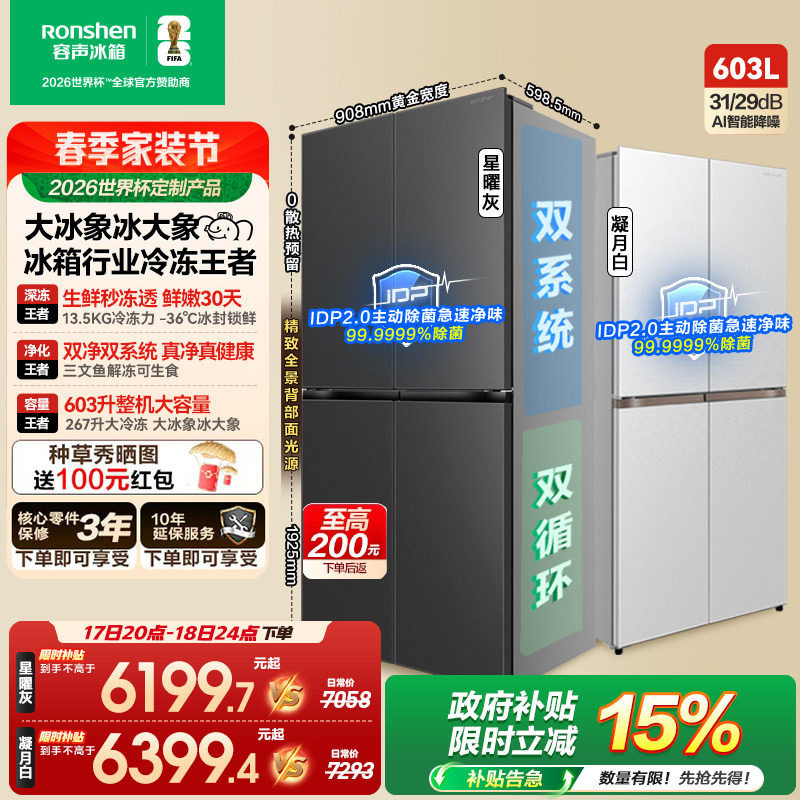 世界杯定制容声大冰象603L双系统十字对开四门超薄嵌入式家用冰箱