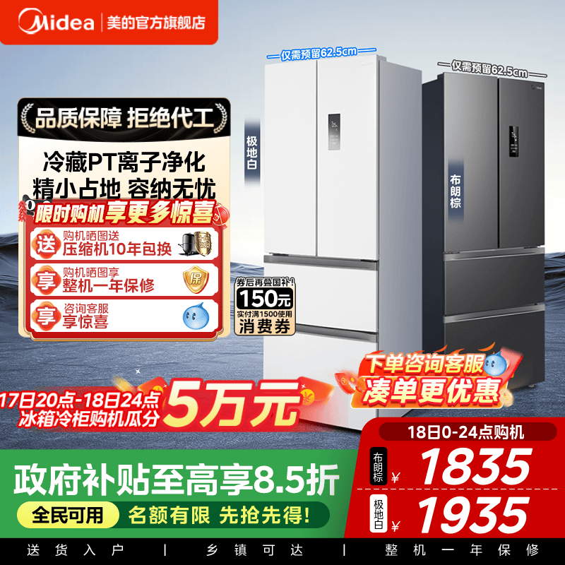 美的500十字对开双开四门大容量家用超薄冰箱一级能效风冷无霜