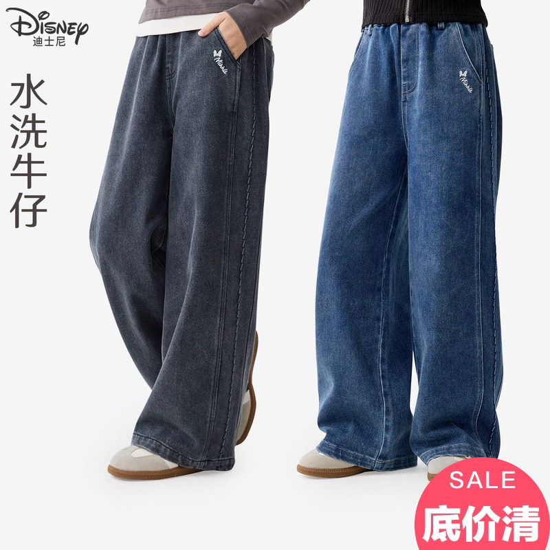 迪士尼女童牛仔裤春秋款儿童裤子中大童直筒阔腿裤青少年宽松韩版