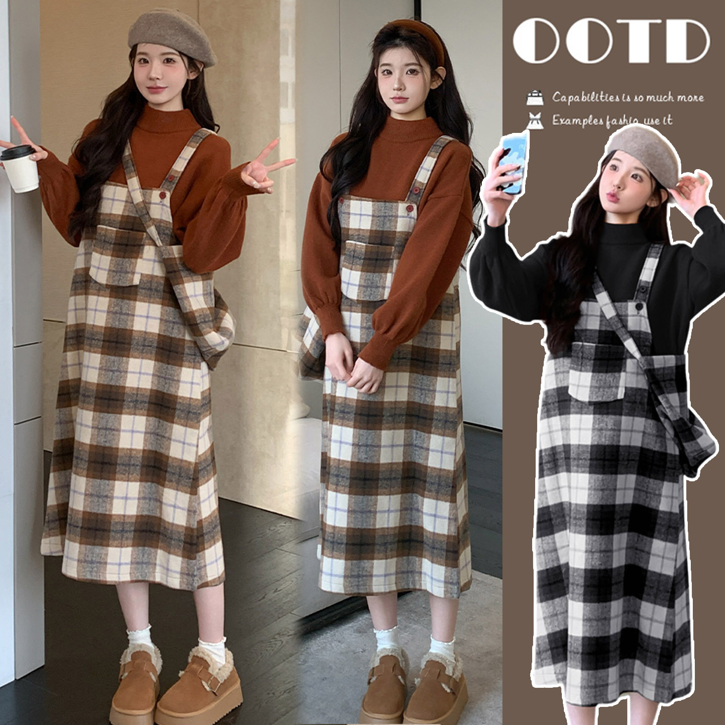 大码女装胖妹妹显瘦减龄盐系格子背带裙+百搭长袖毛衣套装送围巾