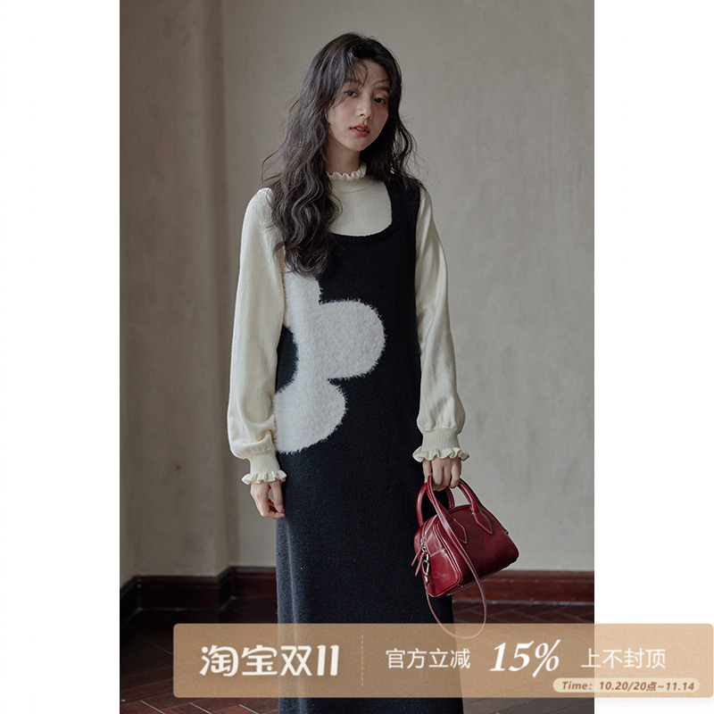 唐狮秋冬季连衣裙黑色背心裙小个子背带裙花朵针织马甲裙毛衣裙u3