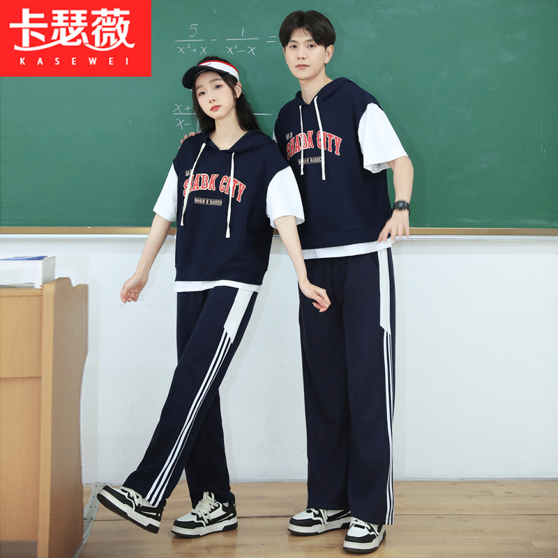 情侣装夏装运动会套装初中高中学生班服假两件学院风连帽校服表演