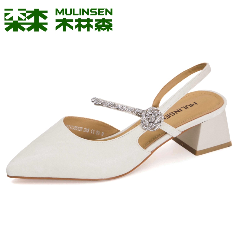 木林森包头凉鞋女夏季法式粗跟水钻尖头玛丽珍羊皮垫时尚韩版单鞋