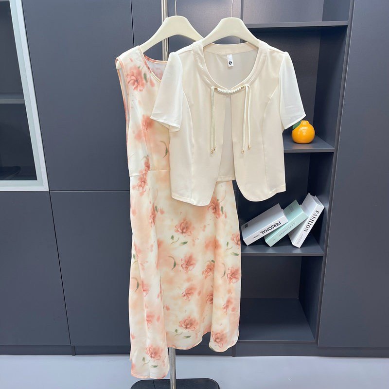 新中式国风妈妈装雪纺两件套连衣裙女短袖夏装新款中长款裙子套装