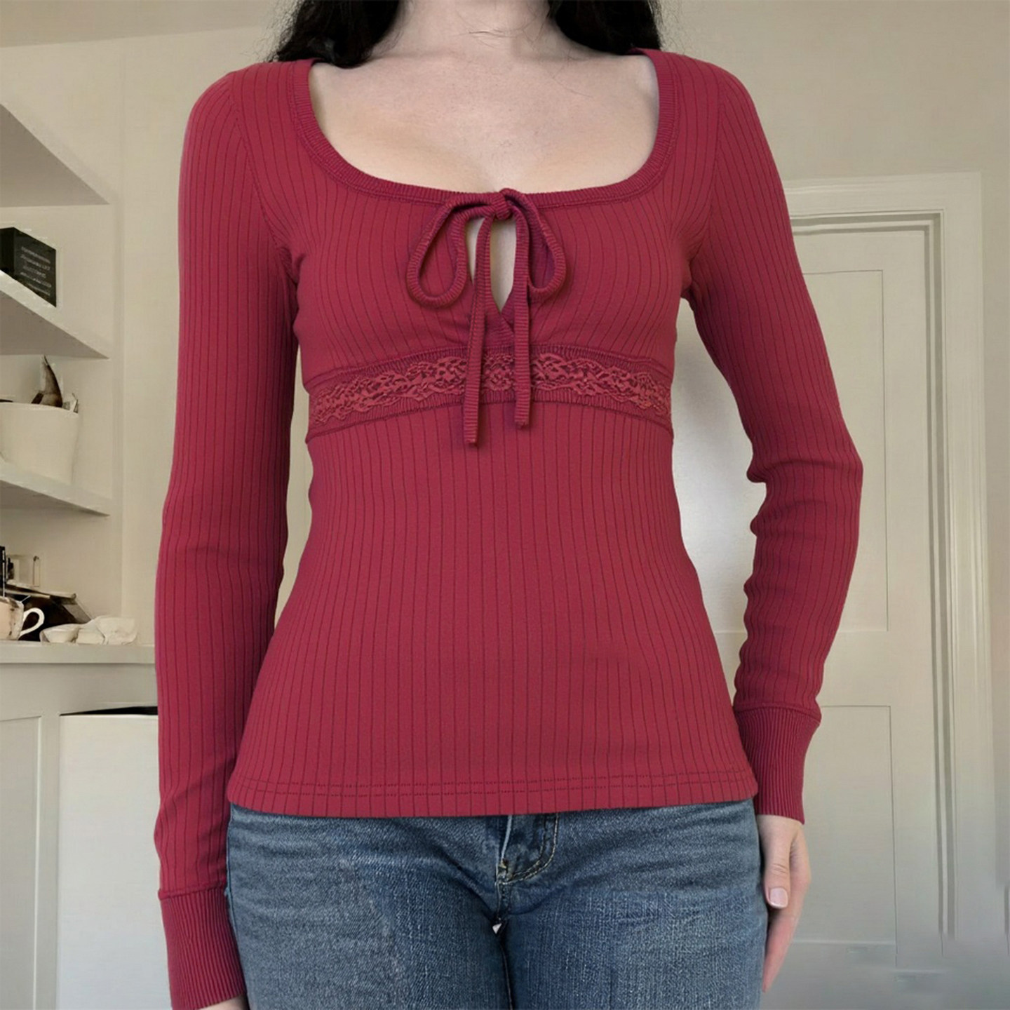 H家欧美女装 法式温柔蕾丝拼接绑带针织上衣修身显瘦红色打底T恤