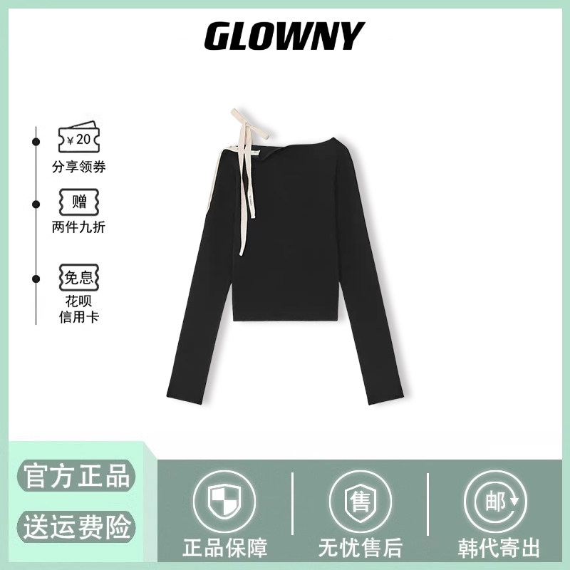 【现货】韩国glowny小众设计斜领显瘦长袖露肩蝴蝶结绑带针织上衣