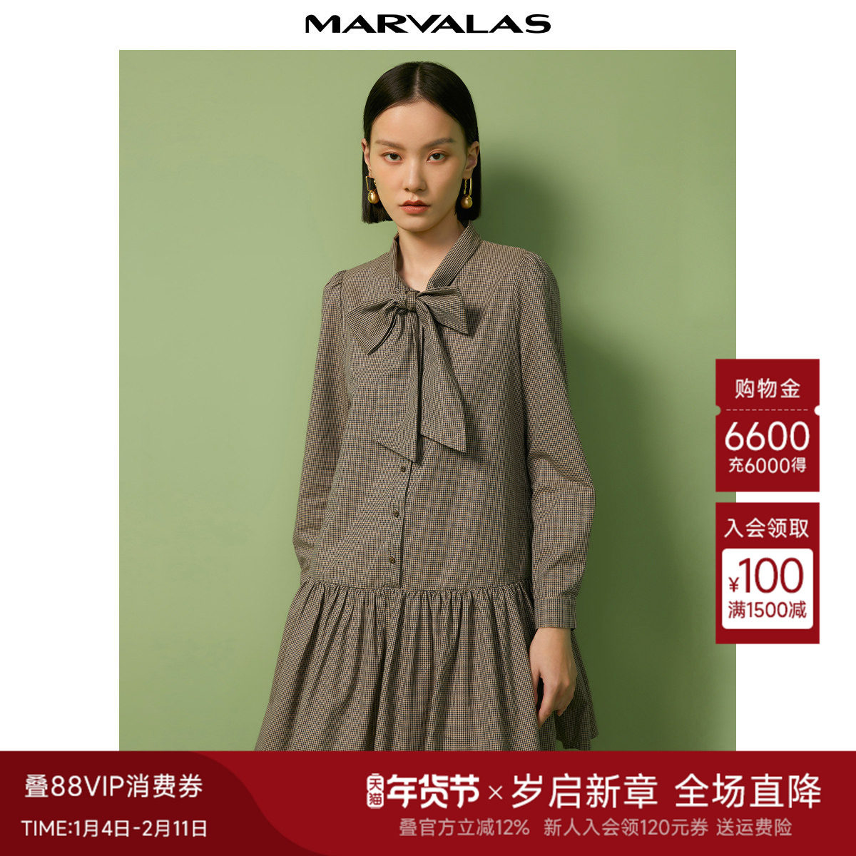 曼德诗百褶衬衫裙女2025秋季新品气质英伦风连衣裙宽松系带雪纺裙
