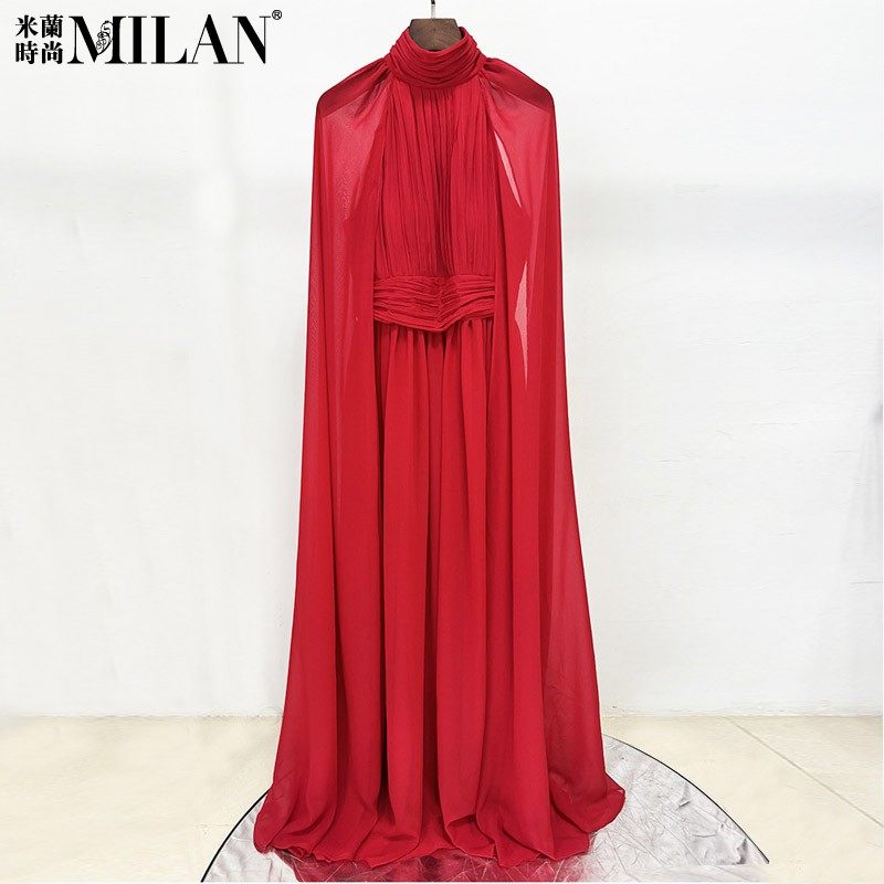 现货2025夏新款欧美明星雪纺飘逸百褶长裙及地长款连衣裙礼服红色